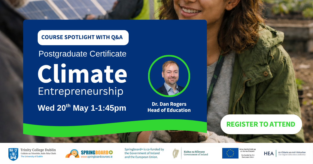 Join Trinity College Dublin for a Spotlight on the part-time Postgraduate Certificate in Climate Entrepreneurship. You'll be hosted by Dr Dan Rogers, Head of Education at Trinity Innovation & Enterprise who will discuss the role of entrepreneurship in climate action, sustainability and the move to net-zero. You'll gain an understanding of the course modules and learning outcomes and hear from a past student about what it's like to participate in this experiential learning programme and how it can benefit you. You'll have a chance ask your questions and understand how to apply.